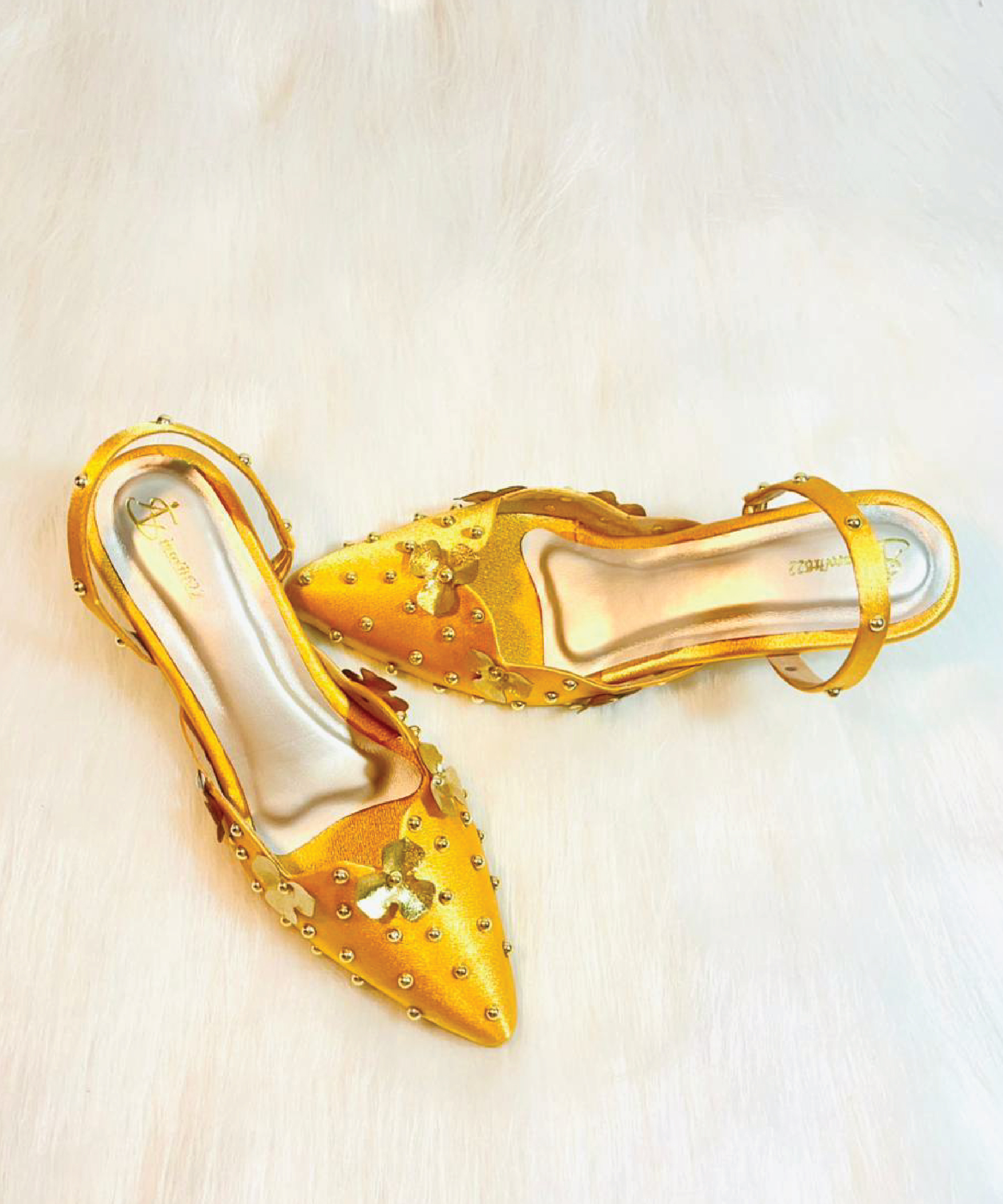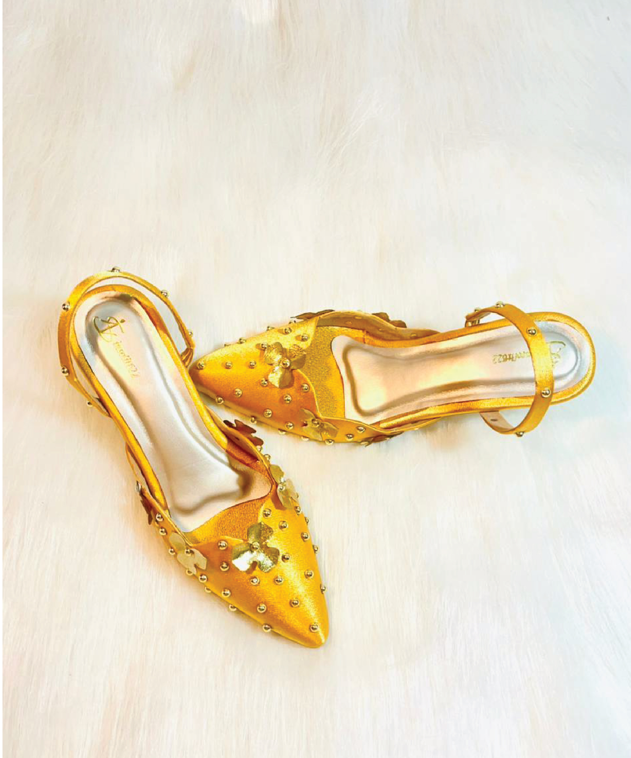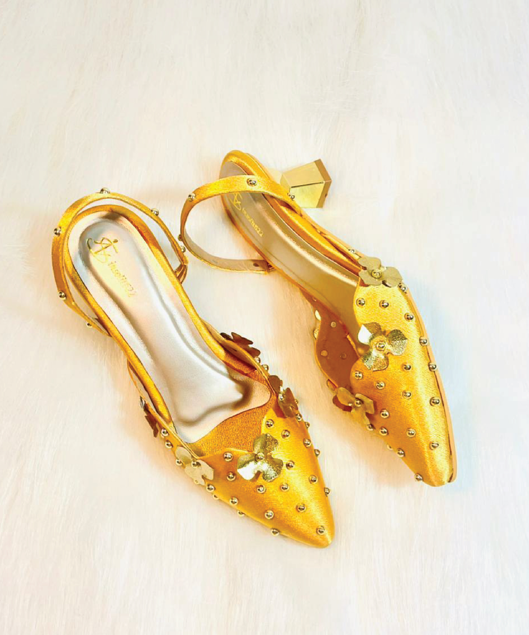Hand-embellished musturd yellow color heel with golden flower and pearls. Metallic gold base. Secure ankle strap. Perfect for all-day festive wear.