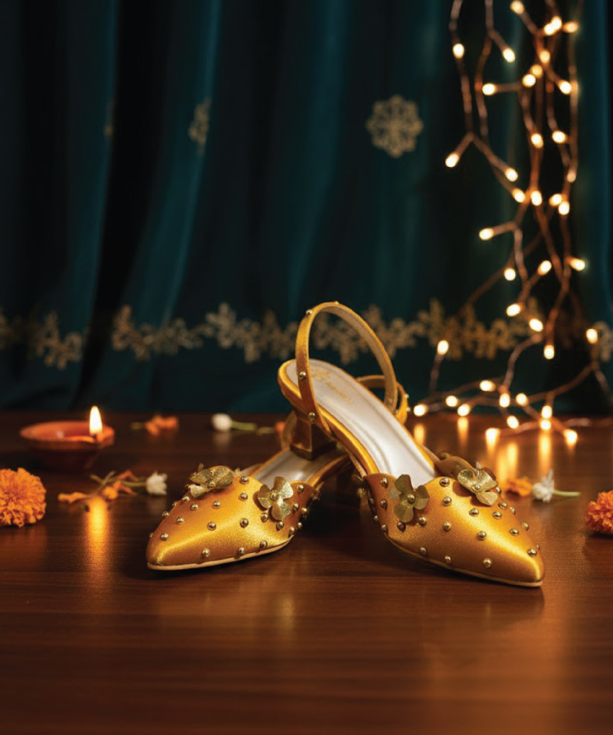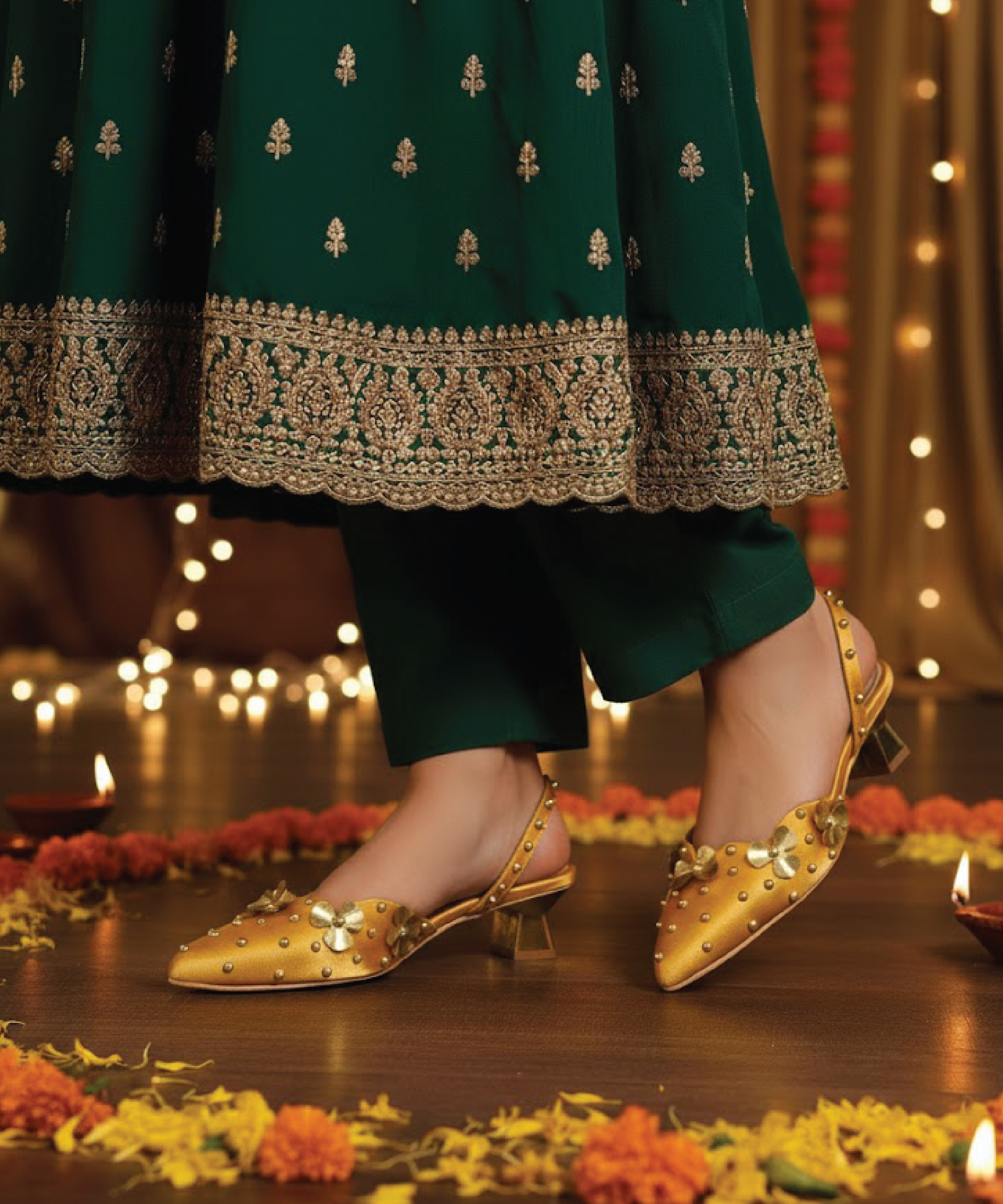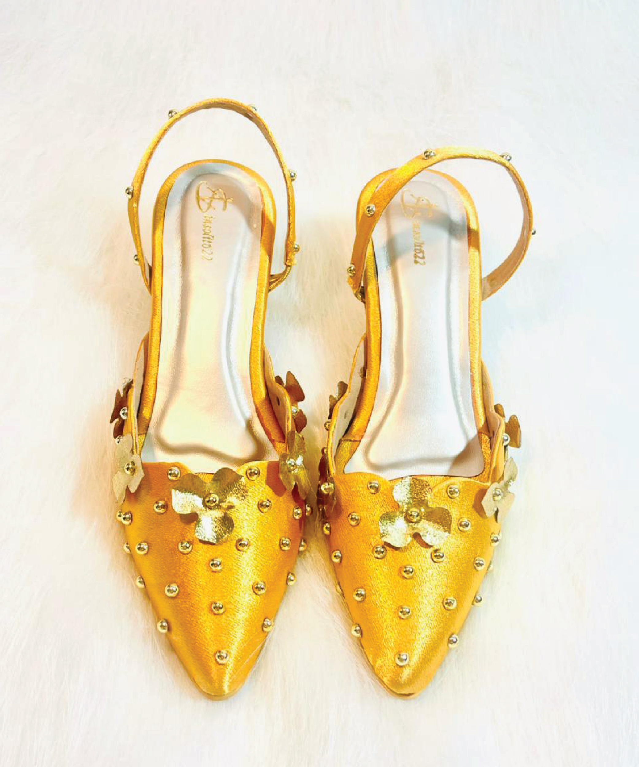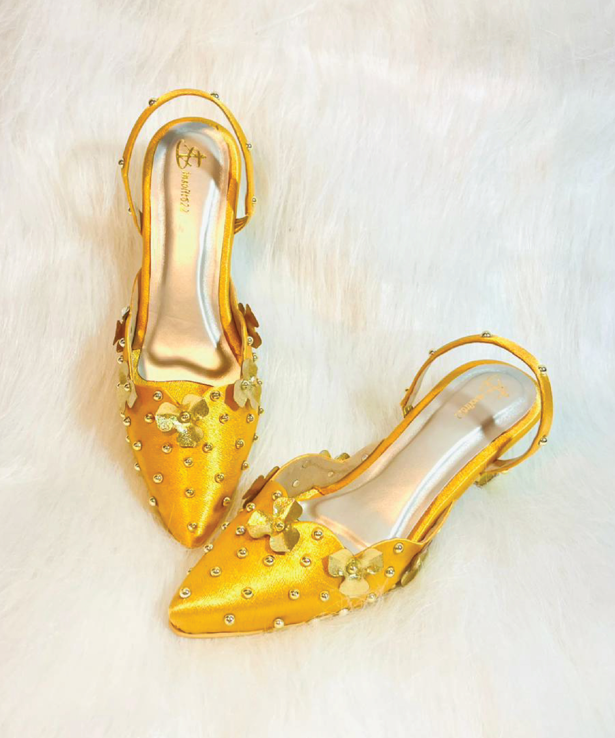 Hand-embellished musturd yellow color heel with golden flower and pearls. Metallic gold base. Secure ankle strap. Perfect for all-day festive wear.