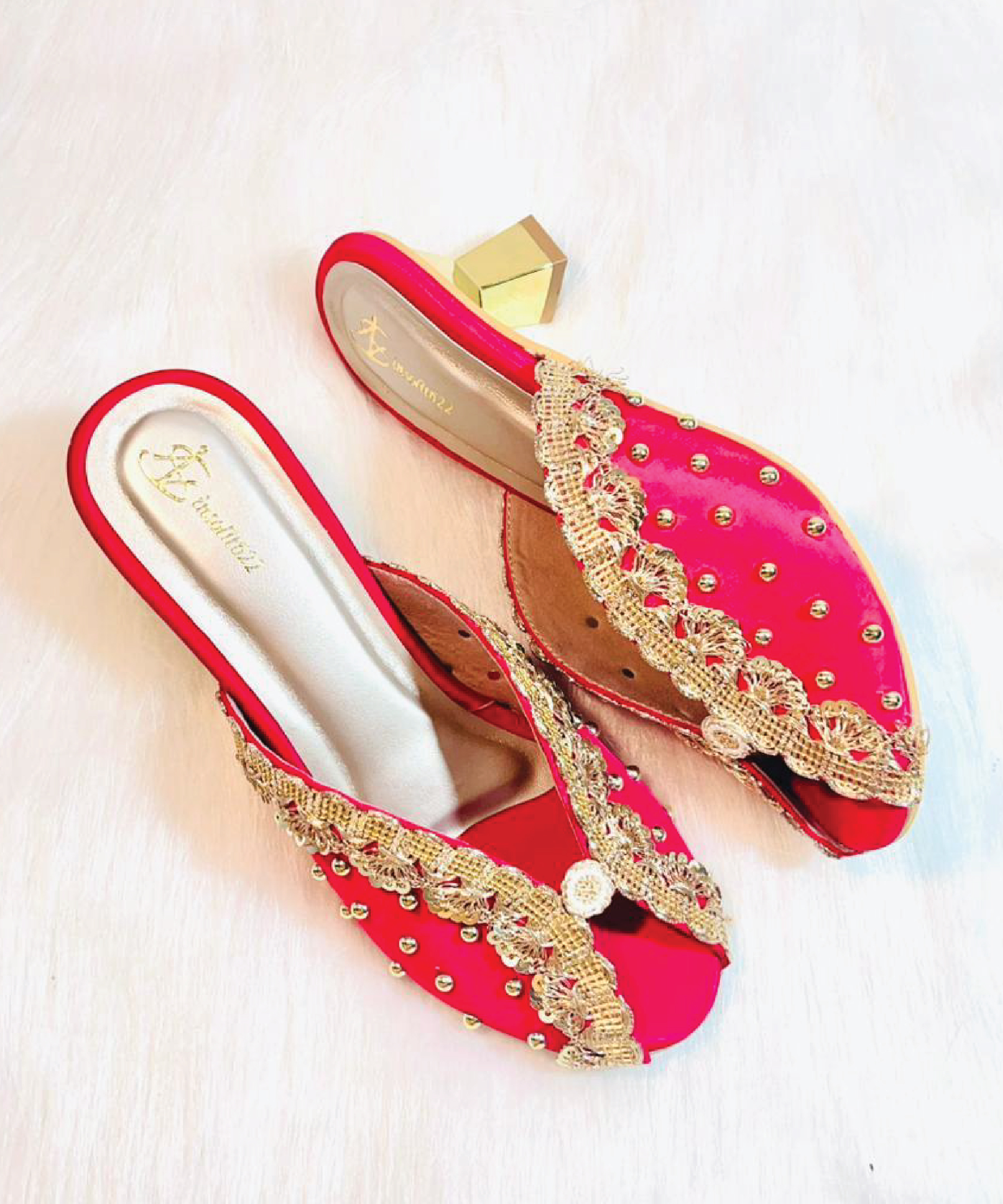 At Insolito22, we believe footwear should reflect personality and confidence. This royal pink mules heel is a celebration of femininity and tradition blended with modern sophistication. The vibrant pink base is enhanced with gold stud embellishments and detailed handcrafted lace borders, creating a regal aesthetic that instantly elevates any outfit.