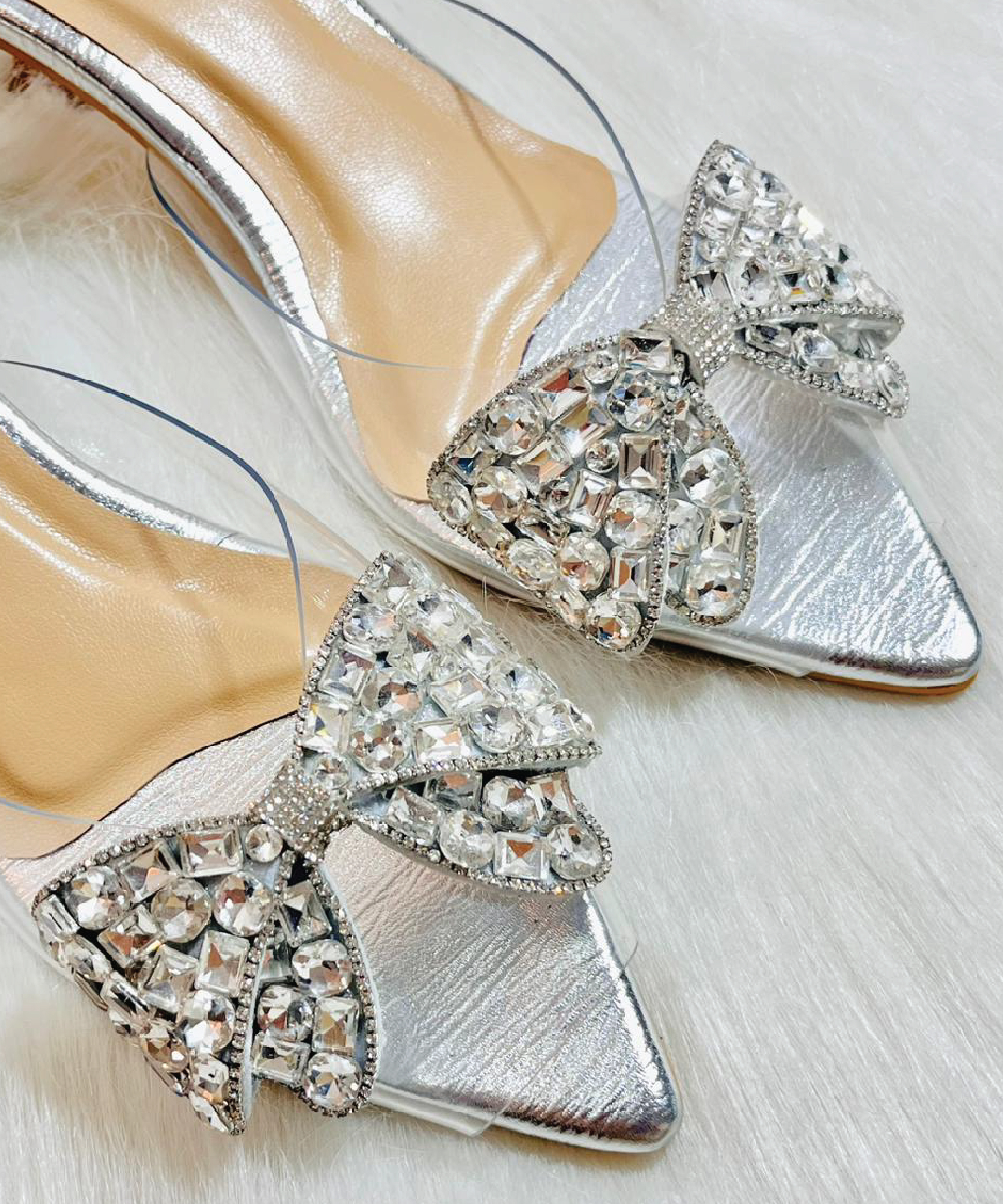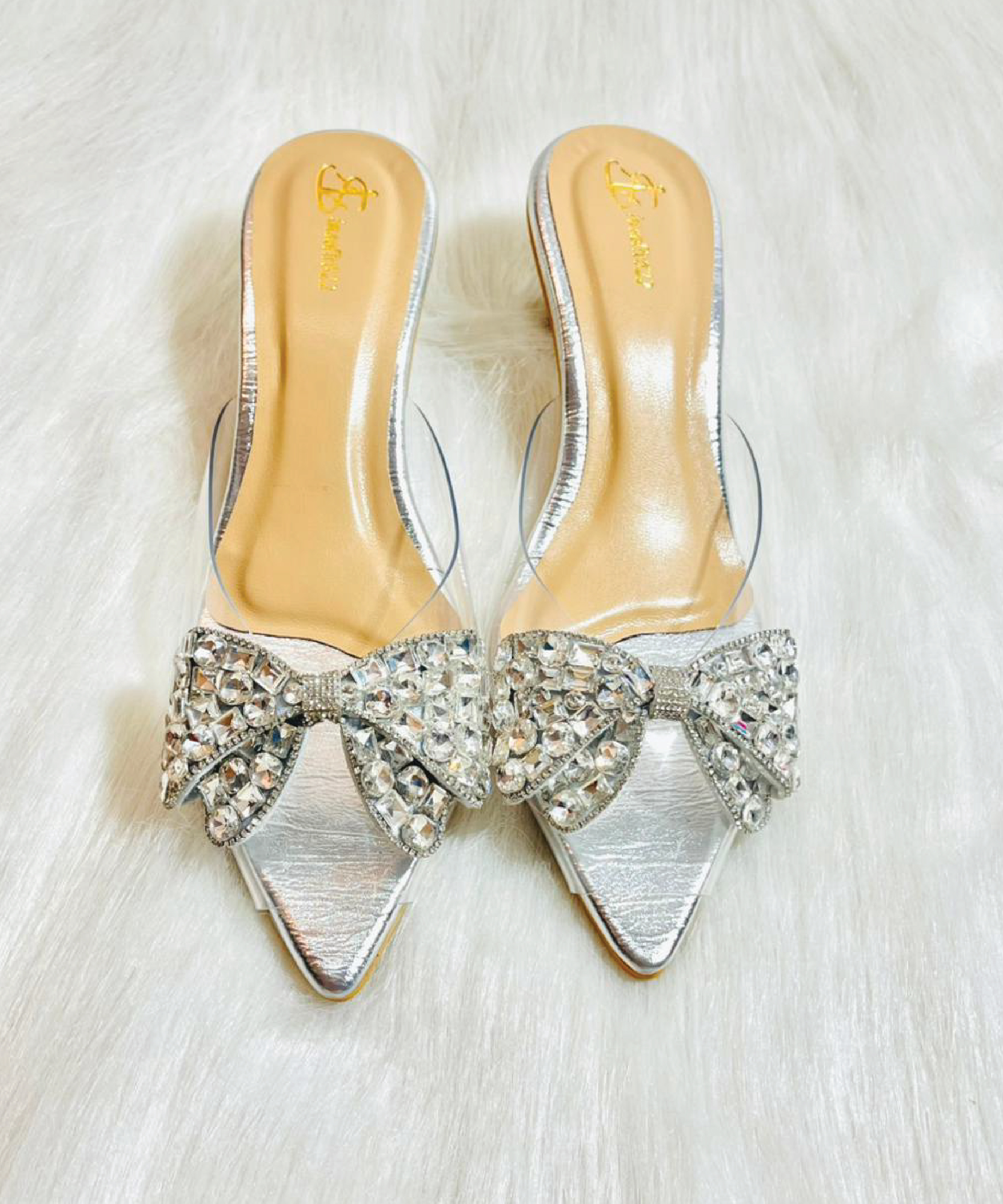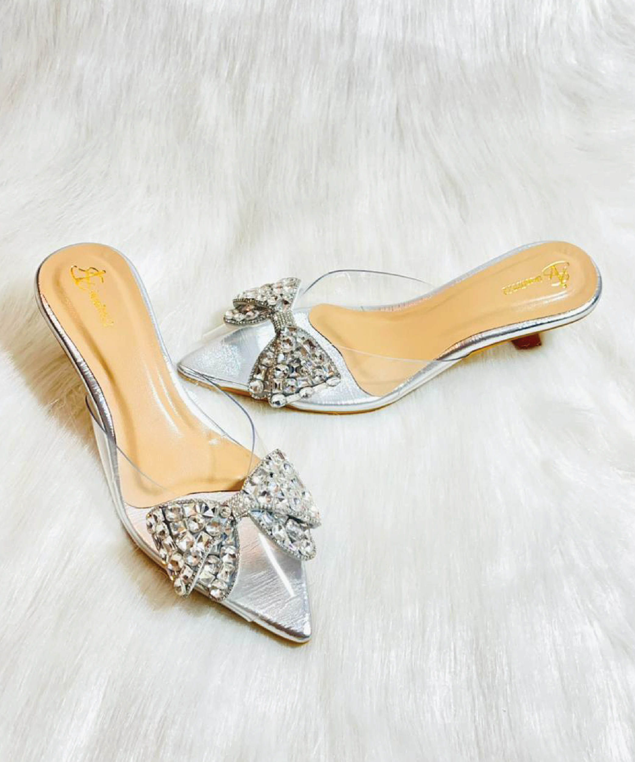 A magical kitten heel mule featuring a striking rhinestone bow over a chic, pointed-toe silhouette.