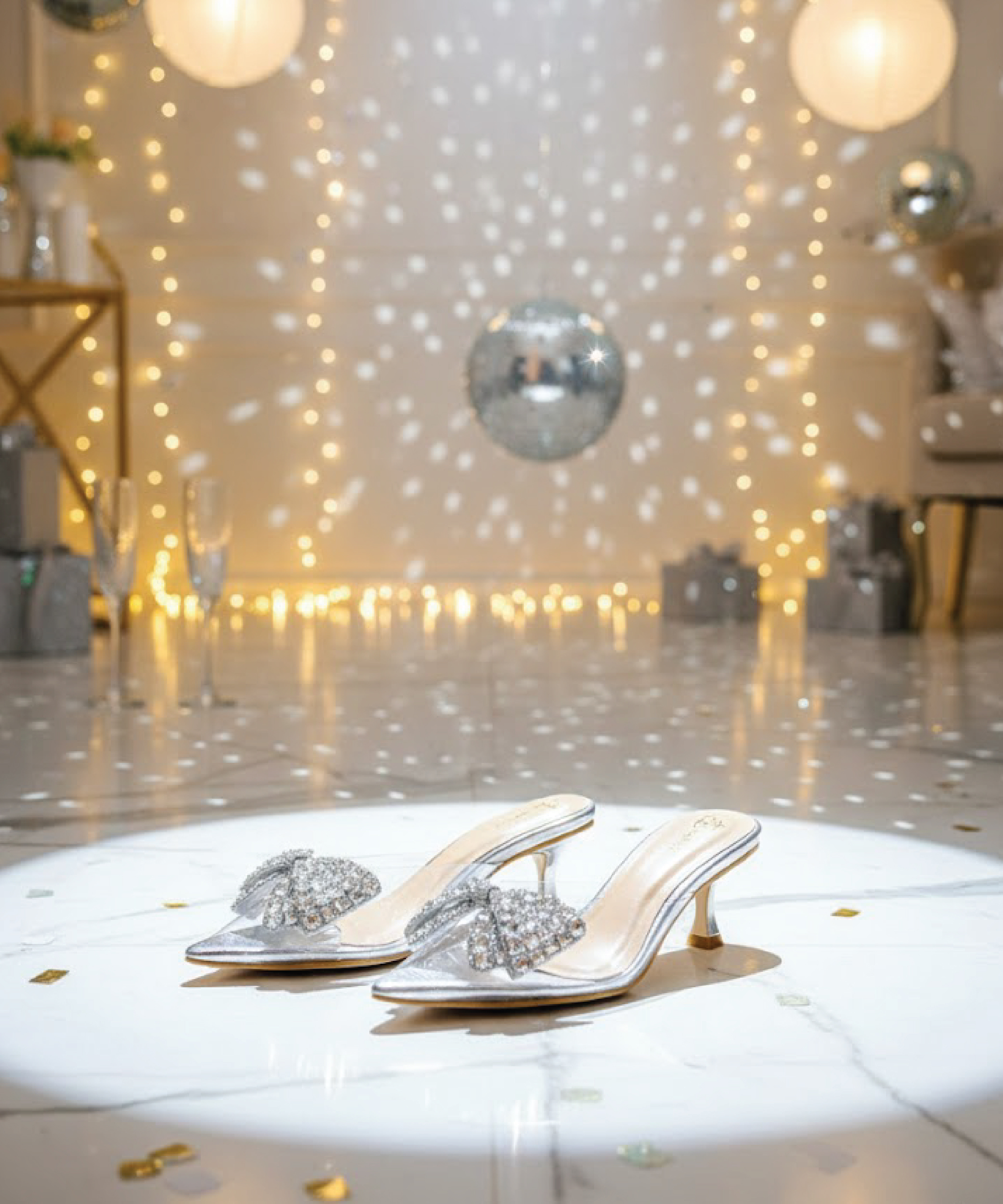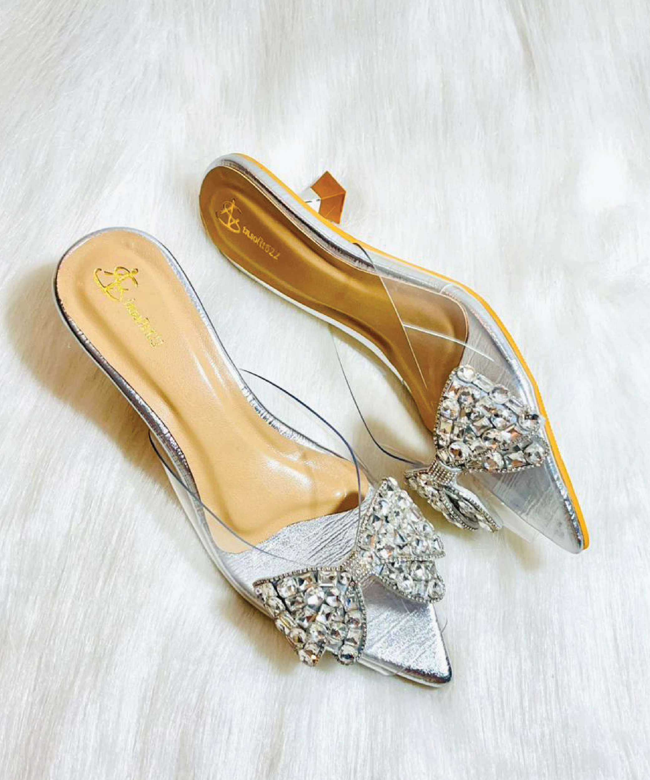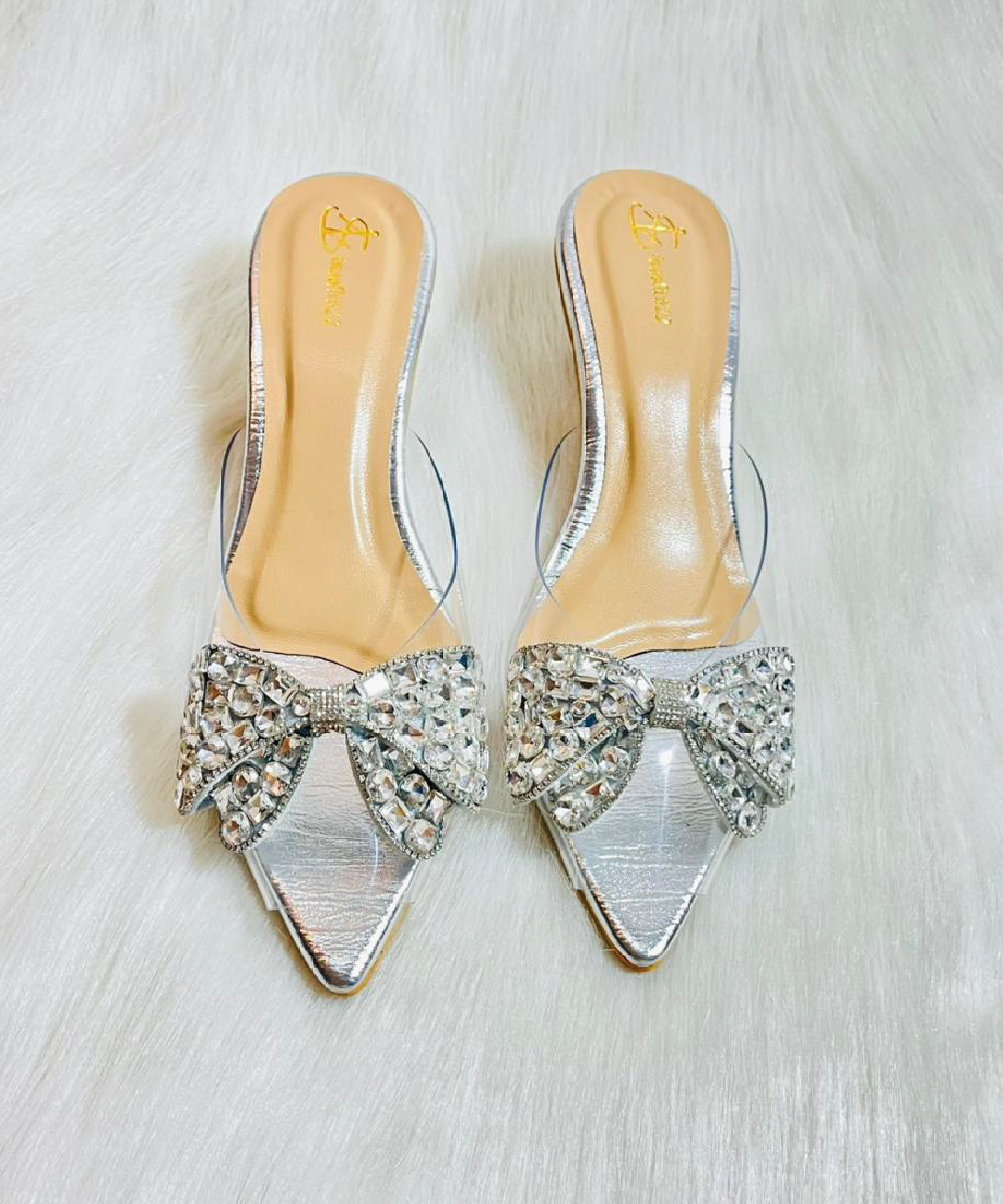 A magical kitten heel mule featuring a striking rhinestone bow over a chic, pointed-toe silhouette.