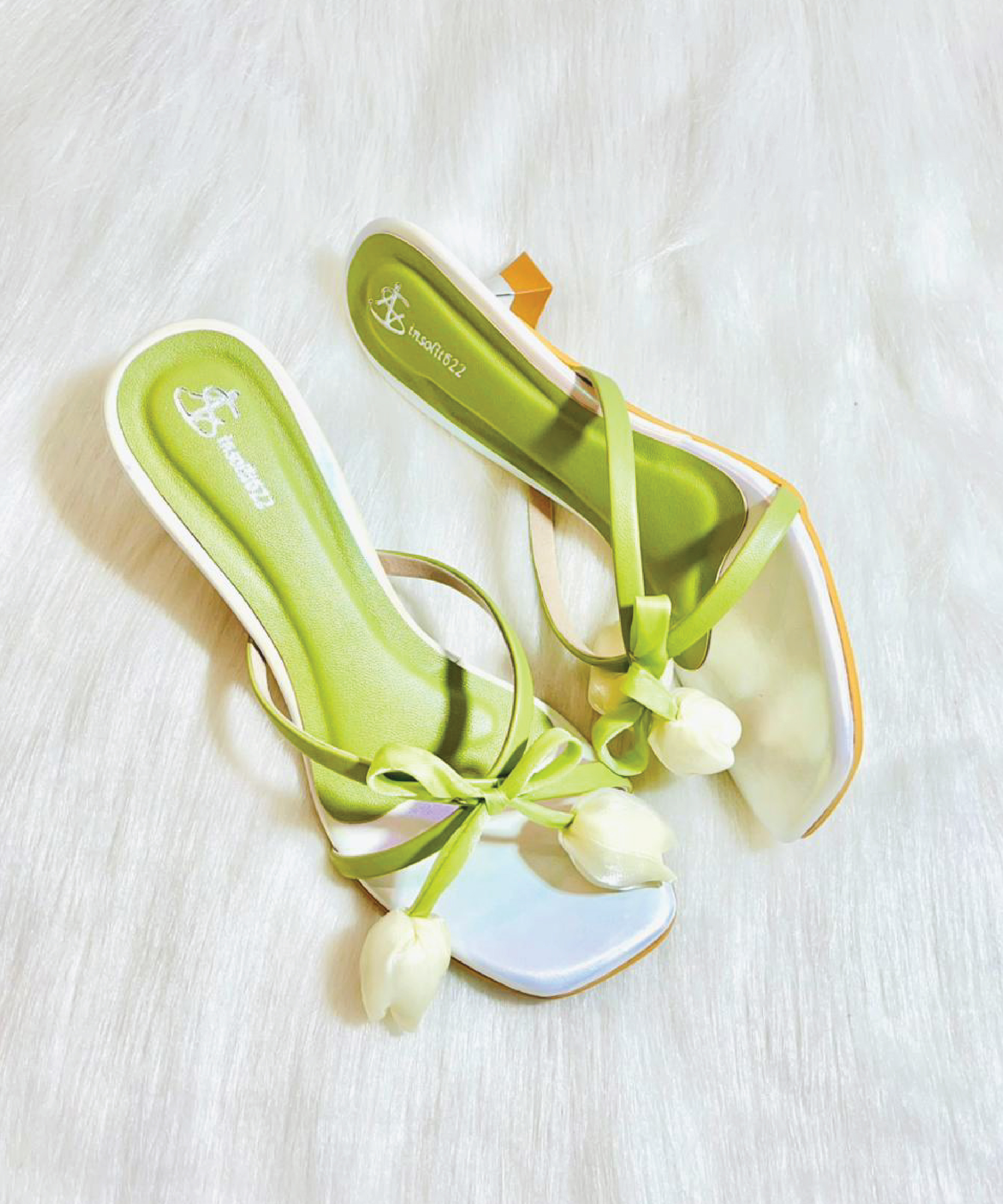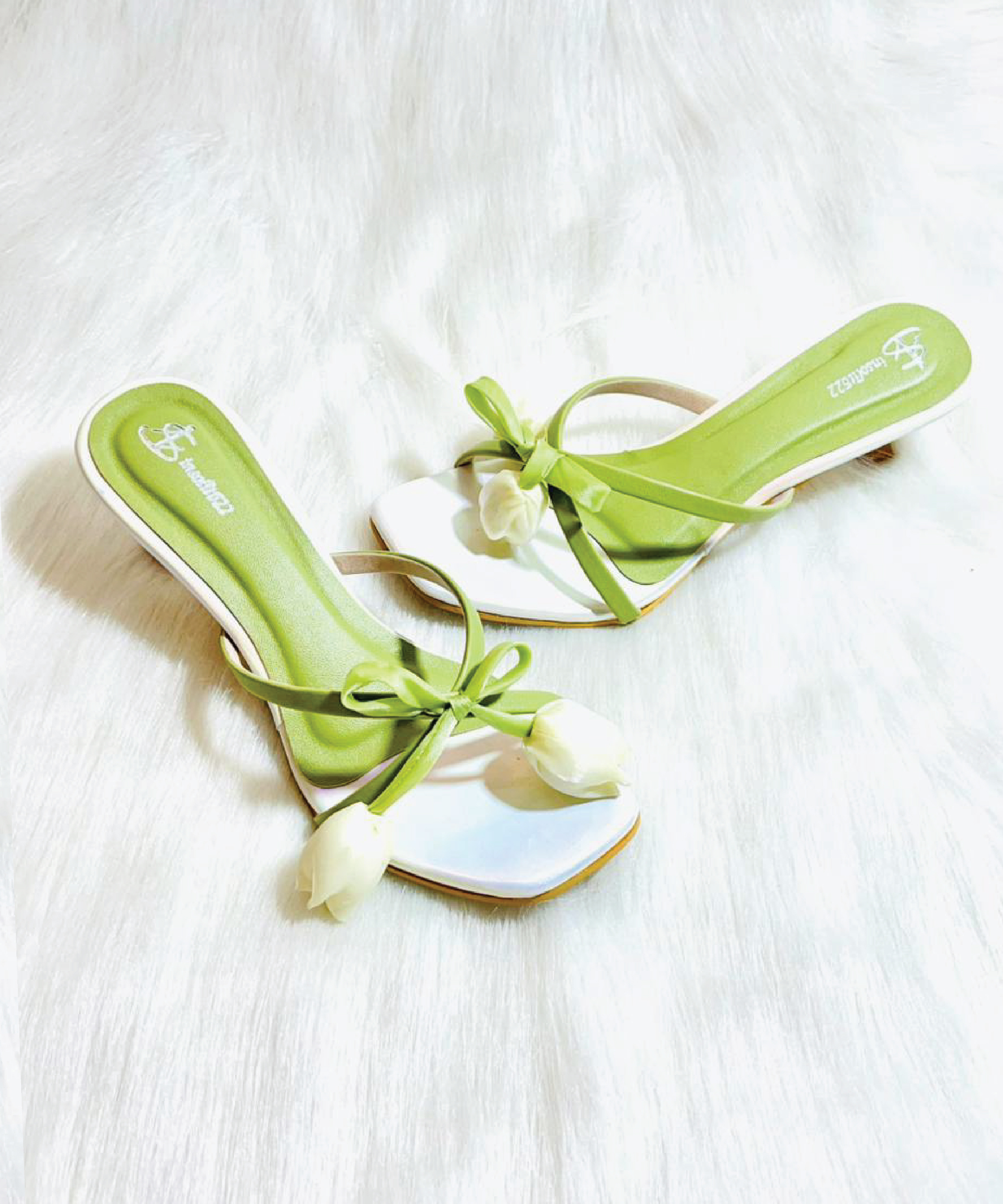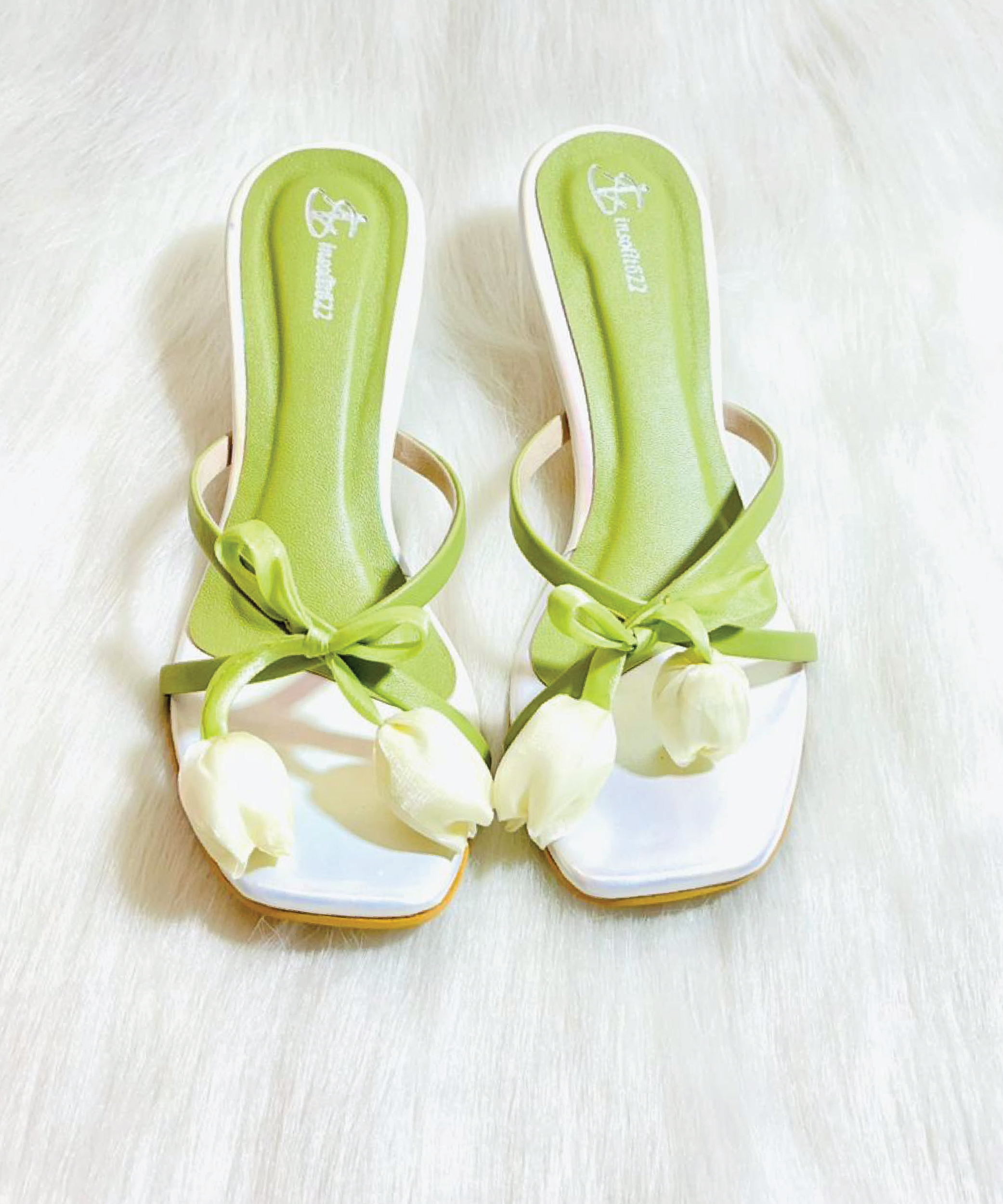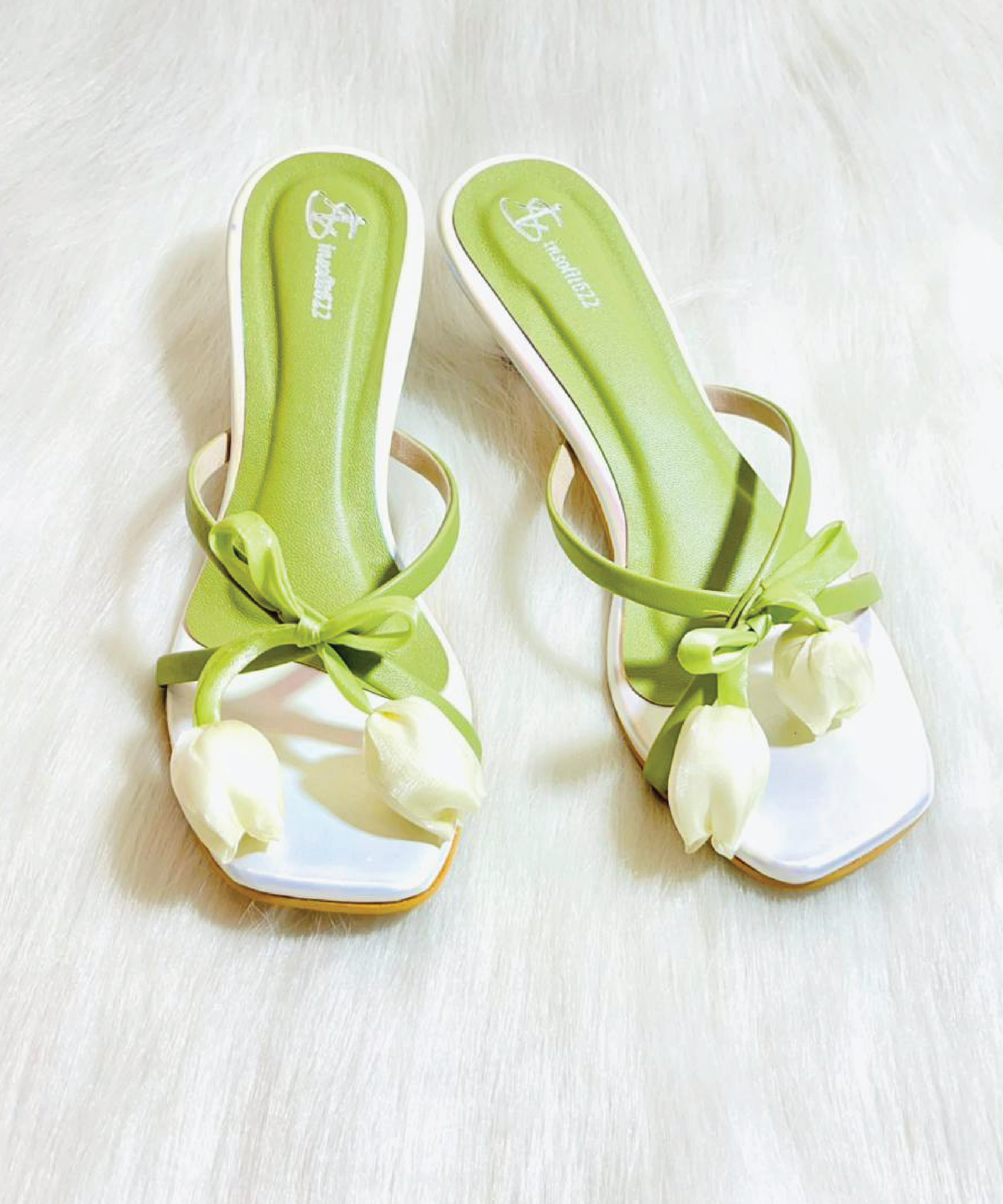 Embrace spring with a whimsical kitten heel featuring a fresh White Tulip and soft green straps gives the fresh and unique addition to your wardrobe.